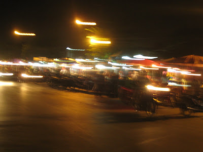 Post-concert, Flemming and I hit the night market a few blocks away, which spans for about 200 meters. We pick up a quick snack of Som Tom, quite savory this time with plenty of fish sauce, and then head over to Malakor for dinner. The restaurant overlooks Wat Ratchaburana, which is basked in a golden light at nighttime. We sit on Malakor's teak porch, the only patrons of the restaurant. Flemming continues to drink and, as they are out of their signature soup, I order a green curry chicken fried rice. It looks like a pedestrian fried rice, but has been cooked with green curry broth instead of water, so it packs a pungent, herbal, spicy, coconutty surprise punch.
