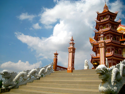 On my way back to central Mui Ne, I stop by Po Shanu Cham Tower, built in the 8th Century. As with the previous Cham towers I've seen in Vietnam, Po Shanu is a series of copper-colored domed temples. At Po Shanu, each represents a different element -- earth, air, fire, water. It's the Captain Planet of ancient Cham temples. The neighboring pagoda offers beautiful views of the Phan Thiet Harbor and the city's main cemetery, with hundreds of rows of tombstones in every color of the rainbow.